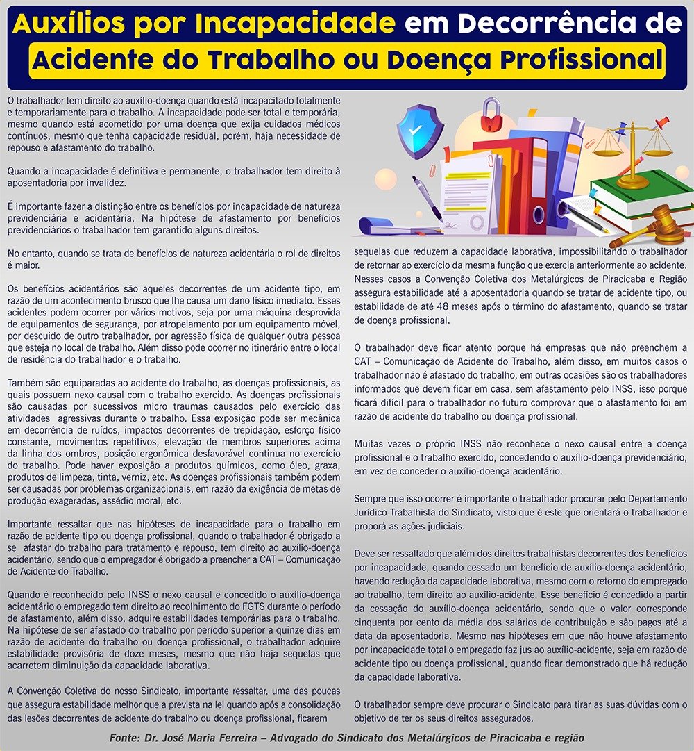 O trabalhador tem direito ao auxílio-doença quando está incapacitado totalmente e temporariamente para o trabalho. A incapacidade pode ser total e temporária, mesmo quando está acometido por uma doença que exija cuidados médicos contínuos, mesmo que tenha capacidade residual, porém, haja necessidade de repouso e afastamento do trabalho. Quando a incapacidade é definitiva e permanente, o trabalhador tem direito à aposentadoria por invalidez. É importante fazer a distinção entre os benefícios por incapacidade de natureza previdenciária e acidentária. Na hipótese de afastamento por benefícios previdenciários o trabalhador tem garantido alguns direitos. No entanto, quando se trata de benefícios de natureza acidentária o rol de direitos é maior. Os benefícios acidentários são aqueles decorrentes de um acidente tipo, em razão de um acontecimento brusco que lhe causa um dano físico imediato. Esses acidentes podem ocorrer por vários motivos, seja por uma máquina desprovida de equipamentos de segurança, por atropelamento por um equipamento móvel, por descuido de outro trabalhador, por agressão física de qualquer outra pessoa que esteja no local de trabalho. Além disso pode ocorrer no itinerário entre o local de residência do trabalhador e o trabalho. Também são equiparadas ao acidente do trabalho, as doenças profissionais, as quais possuem nexo causal com o trabalho exercido. As doenças profissionais são causadas por sucessivos micro traumas causados pelo exercício das atividades agressivas durante o trabalho. Essa exposição pode ser mecânica em decorrência de ruídos, impactos decorrentes de trepidação, esforço físico constante, movimentos repetitivos, elevação de membros superiores acima da linha dos ombros, posição ergonômica desfavorável continua no exercício do trabalho. Pode haver exposição a produtos químicos, como óleo, graxa, produtos de limpeza, tinta, verniz, etc. As doenças profissionais também podem ser causadas por problemas organizacionais, em razão da exigência de metas de produção exageradas, assédio moral, etc. Importante ressaltar que nas hipóteses de incapacidade para o trabalho em razão de acidente tipo ou doença profissional, quando o trabalhador é obrigado a se afastar do trabalho para tratamento e repouso, tem direito ao auxílio-doença acidentário, sendo que o empregador é obrigado a preencher a CAT – Comunicação de Acidente do Trabalho. Quando é reconhecido pelo INSS o nexo causal e concedido o auxílio-doença acidentário o empregado tem direito ao recolhimento do FGTS durante o período de afastamento, além disso, adquire estabilidades temporárias para o trabalho. Na hipótese de ser afastado do trabalho por período superior a quinze dias em razão de acidente do trabalho ou doença profissional, o trabalhador adquire estabilidade provisória de doze meses, mesmo que não haja sequelas que acarretem diminuição da capacidade laborativa. A Convenção Coletiva do nosso Sindicato, importante ressaltar, uma das poucas que assegura estabilidade melhor que a prevista na lei quando após a consolidação das lesões decorrentes de acidente do trabalho ou doença profissional, ficarem sequelas que reduzem a capacidade laborativa, impossibilitando o trabalhador de retornar ao exercício da mesma função que exercia anteriormente ao acidente. Nesses casos a Convenção Coletiva dos Metalúrgicos de Piracicaba e Região assegura estabilidade até a aposentadoria quando se tratar de acidente tipo, ou estabilidade de até 48 meses após o término do afastamento, quando se tratar de doença profissional. O trabalhador deve ficar atento porque há empresas que não preenchem a CAT – Comunicação de Acidente do Trabalho, além disso, em muitos casos o trabalhador não é afastado do trabalho, em outras ocasiões são os trabalhadores informados que devem ficar em casa, sem afastamento pelo INSS, isso porque ficará difícil para o trabalhador no futuro comprovar que o afastamento foi em razão de acidente do trabalho ou doença profissional. Muitas vezes o próprio INSS não reconhece o nexo causal entre a doença profissional e o trabalho exercido, concedendo o auxílio-doença previdenciário, em vez de conceder o auxílio-doença acidentário. Sempre que isso ocorrer é importante o trabalhador procurar pelo Departamento Jurídico Trabalhista do Sindicato, visto que é este que orientará o trabalhador e proporá as ações judiciais. Deve ser ressaltado que além dos direitos trabalhistas decorrentes dos benefícios por incapacidade, quando cessado um benefício de auxílio-doença acidentário, havendo redução da capacidade laborativa, mesmo com o retorno do empregado ao trabalho, tem direito ao auxílio-acidente. Esse benefício é concedido a partir da cessação do auxílio-doença acidentário, sendo que o valor corresponde cinquenta por cento da média dos salários de contribuição e são pagos até a data da aposentadoria. Mesmo nas hipóteses em que não houve afastamento por incapacidade total o empregado faz jus ao auxílio-acidente, seja em razão de acidente tipo ou doença profissional, quando ficar demonstrado que há redução da capacidade laborativa. O trabalhador sempre deve procurar o Sindicato para tirar as suas dúvidas com o objetivo de ter os seus direitos assegurados.