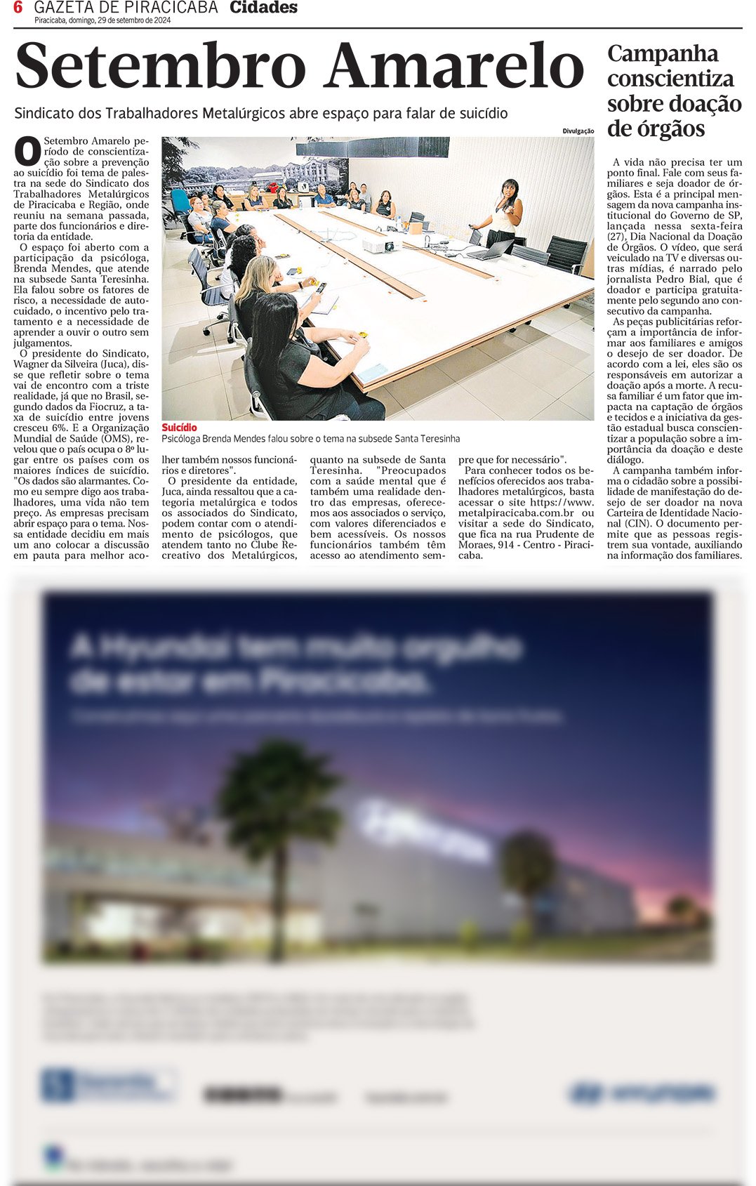 O Setembro Amarelo período de conscientização sobre a prevenção ao suicídio foi tema de palestra na sede do Sindicato dos Trabalhadores Metalúrgicos de Piracicaba e Região.