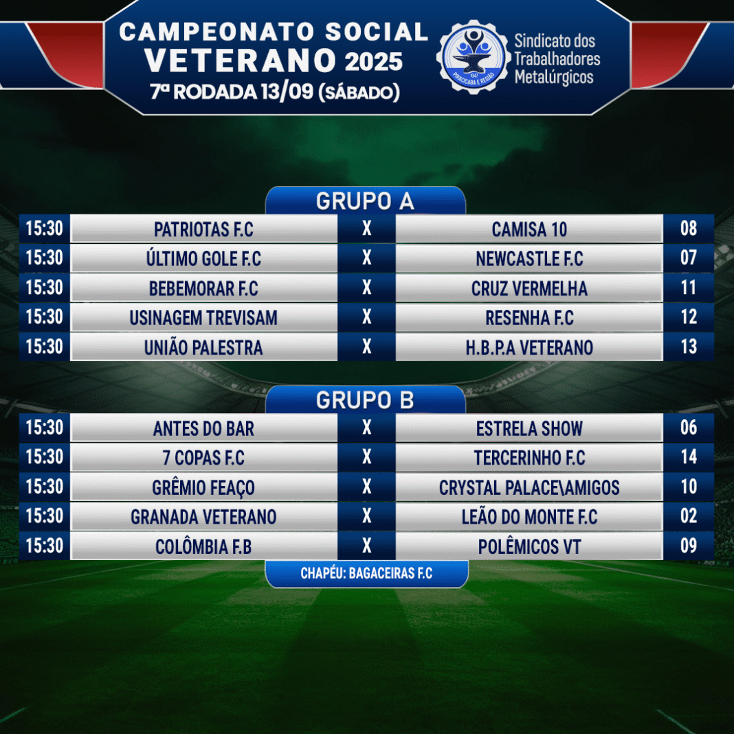 O Campeonato de Futebol Veterano segue firme no Clube Recreativo dos Metalúrgicos. A próxima rodada será dia 13, sábado.